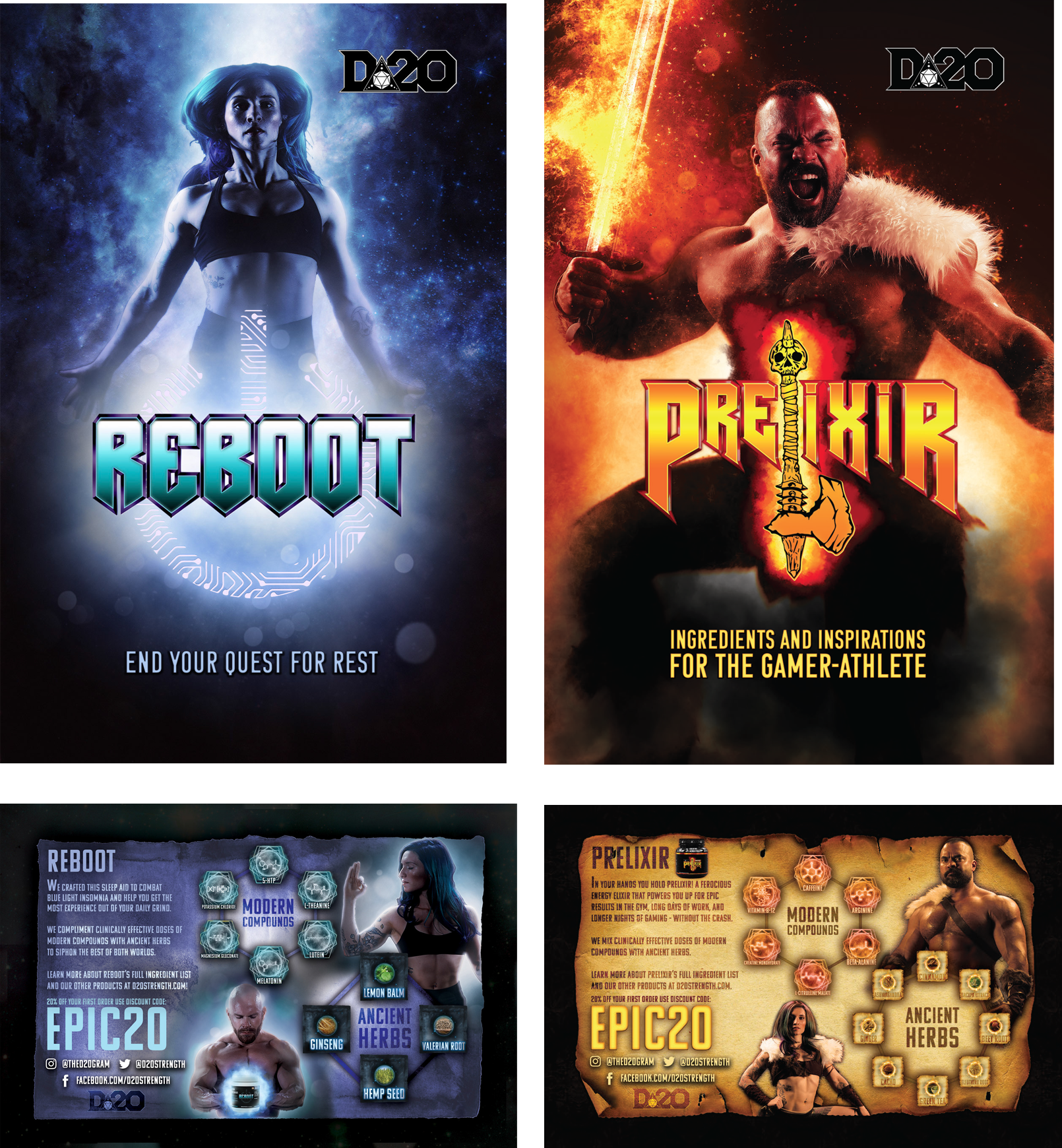 Designed front-and-back product cards for D20 Strength, representing two distinct supplements: Reboot, focused on recovery and rest, and Prelixir, built for focus, energy, and stamina during gaming. The designs translated each product’s purpose into a cohesive fantasy-inspired visual system aligned with the brand’s RPG identity.